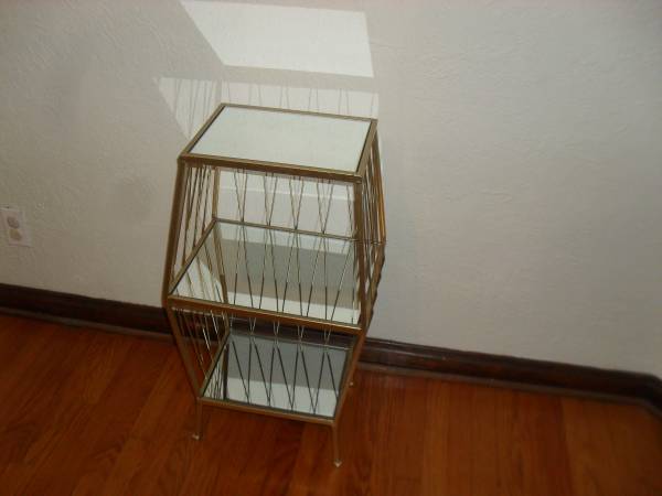 Retro mirror table/shelf, brass plated metal frame, the top and bottom shelf is 12 3/4" x 10", the middle shelf is 16"x 12", overall height is 28 3/4", $200.00 (cash only)