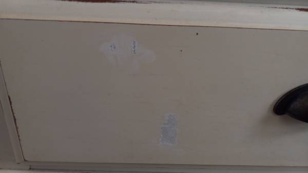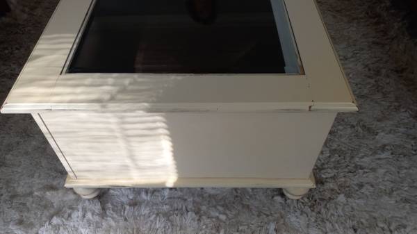 This is a wonderful cream colored display case coffee table for any memorabilia, artwork, or special items. It has two drawers under the top drawer for extra storage or things you may want to display at special times. It's very solid and heavy, you'll need 2 people to move it. Has two spots on one drawer that have been touched up, as pictured. It has a tiny chip on one of the corners of the glass top that you can't really see. This is a very unique table, done in the shabby sheek, or beach worn style. Asking $180 CASH ONLY