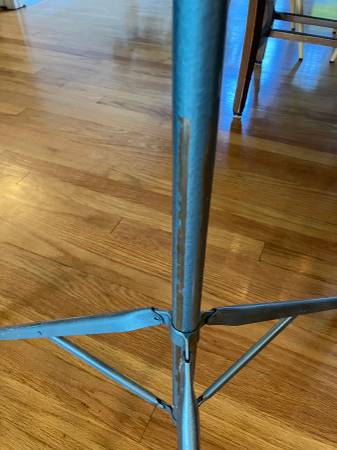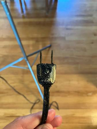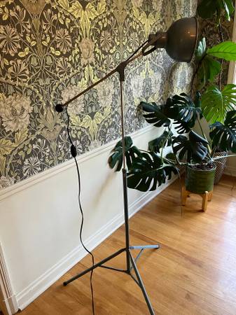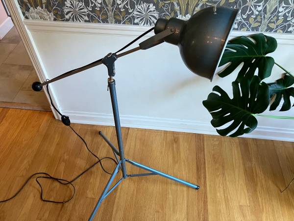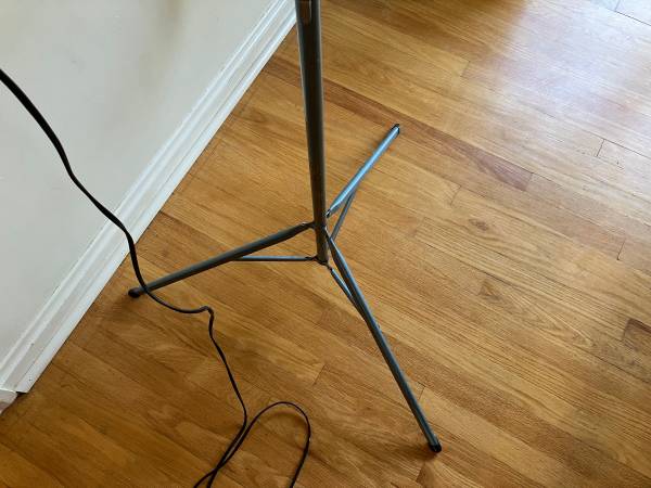 Lamp will not turn on. The button to adjust the height will not hold it in place anymore, so best used on the shortest setting. Legs are steady once they are set up. Bretford sticker inside.