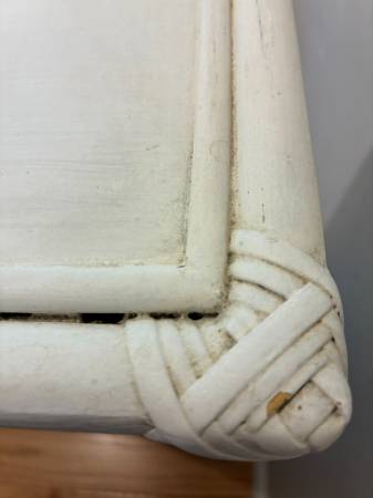 Vintage Cabinet Narrow 4 Cubes Wooden and Wicker 40 1/2" T x 8 7/8W x 8D. 4 Cubes average size 7 1/2"D x 7W x 8T. Painted white wood with wicker wrap on corners. Scuff marks and a little dirty creases and a little yellowed top. I live close to south county mall in Oakville. I prefer text or call please, thanks.