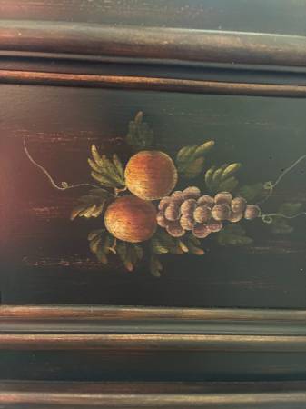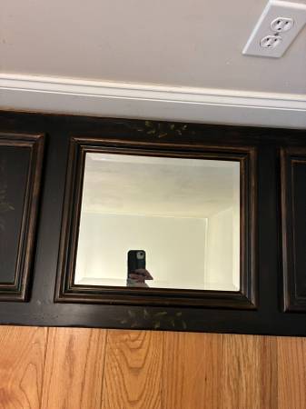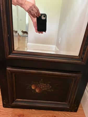 Vintage Mirror Decorative Hand Painted Wooden Panel. 46" W x 19 T x 1 3/4 D. Mirror only 14 1/2 W x 12 T. Made by "Bassett Mirror CO. Inc. Sturdy construction with hanging hardware on back. It's in great condition. I live close to south county mall in Oakville. I prefer text or call, please, thanks.