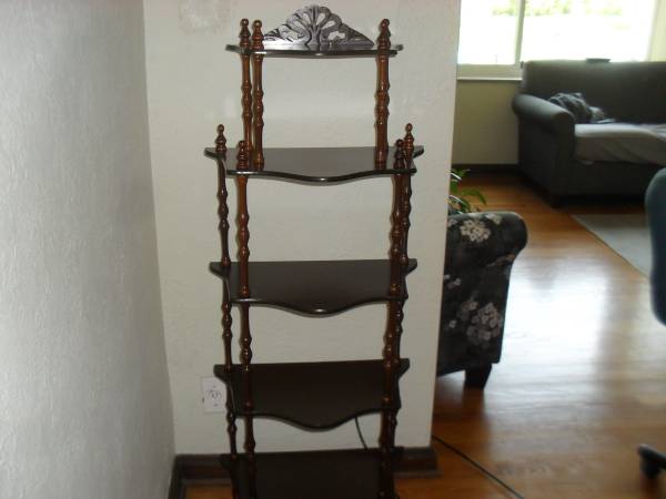 5-Tier wood shelf, the top shelf is 7 1/2" x 14 1/2", the remaining shelves are 10 3/4" x 18 3/4", overall height is 51", $40.00 (cash only)