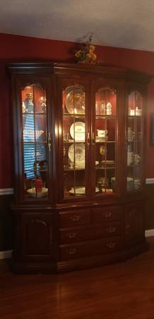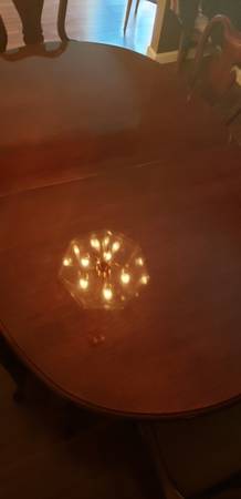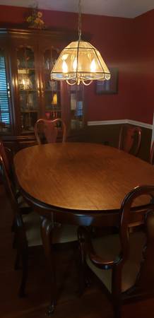 Excellent condition Thomasville Dining Set. 6 Chairs (2 arm chairs) Chairs are newly reupholstered. There are two leafs for this table (not shown) so it will seat 10 easily. Table pads for the table...