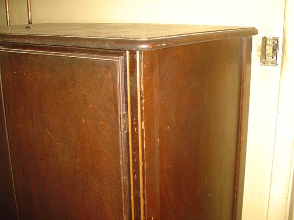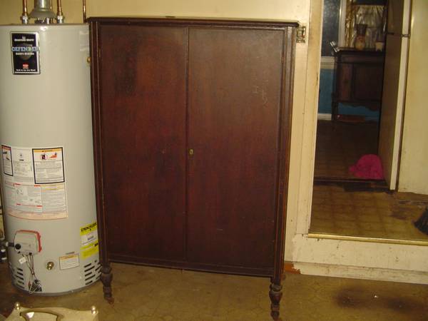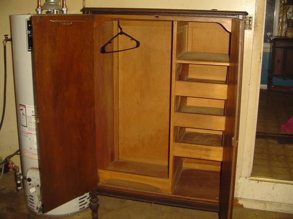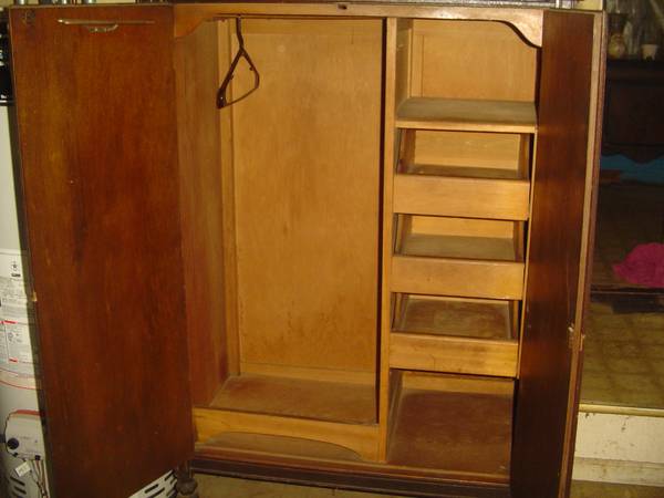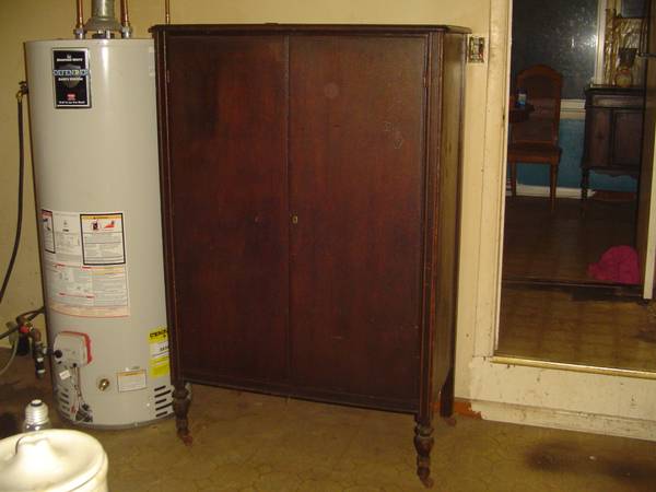 I am selling this antique wood Armoire wardrobe on wheels with key for $100. It has some minor wear but is in good condition for its age. It is 58 1/2 inches tall and 36 1/2 inches long and 20 inches wide. I am located in Sullivan Mo. Call or Text 573-25nine-8395