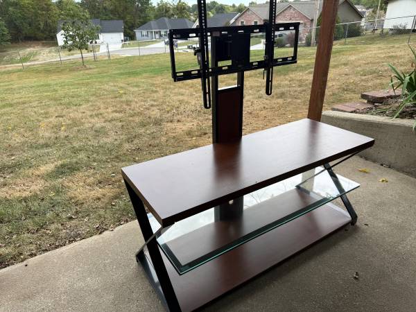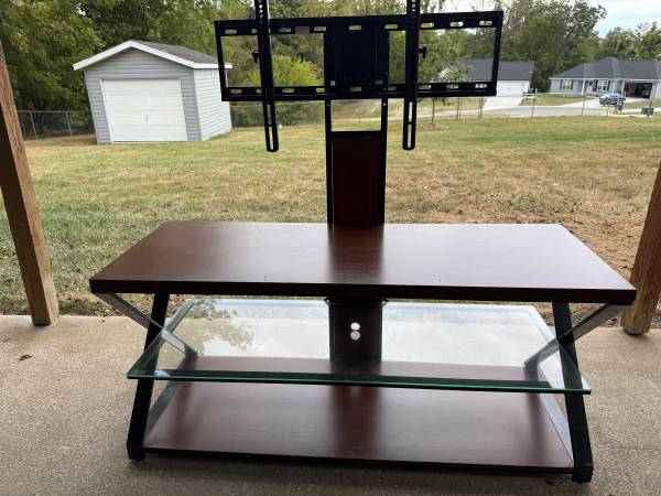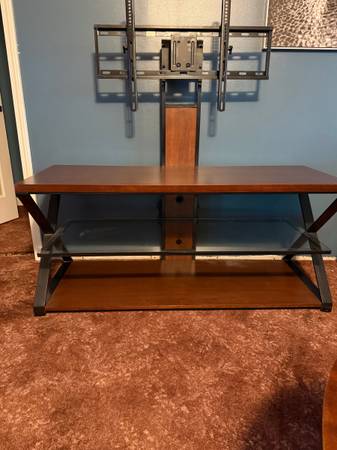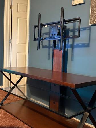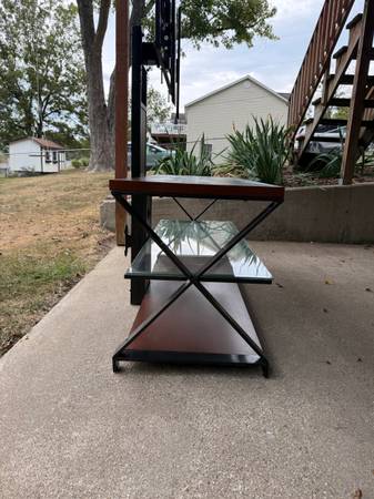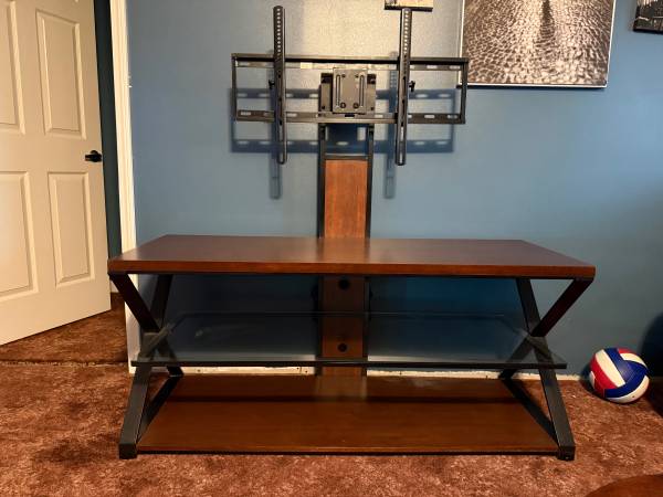 75”Lx20”Wx22.5H brown with black metal legs TV stand with glass middle shelf. Back TV mount. Currently has a 75” tv sitting on it without being mounted however it is missing one bolt. Smaller TV could mount easily with a replacement or standing directly on the stand. Looks brand new, very sturdy not cheaply made. Pick up only.