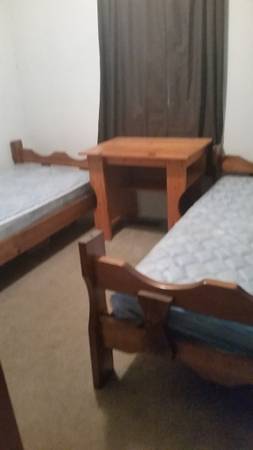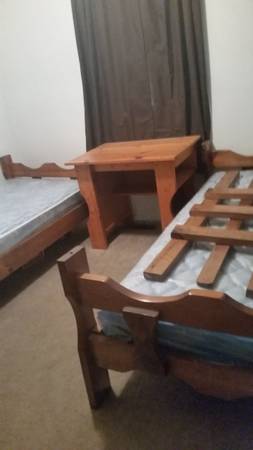 Pine bunk beds with ladder or usable as two twins. Small student desk also available for $ $25.00 pick up Washington Missouri. Please call 636-four three three- five zero one zero. This is a landline so please leave a message and I will return your call
