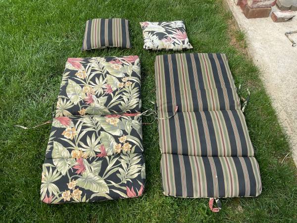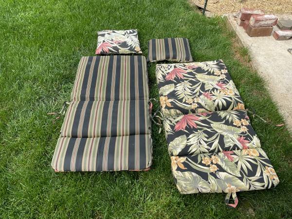 2 Reversible cushions (44” x 22”) and 2 pillows for lawn chairs. Used and have some little burn holes but not noticeable if you’re not looking for them. Asking $30.