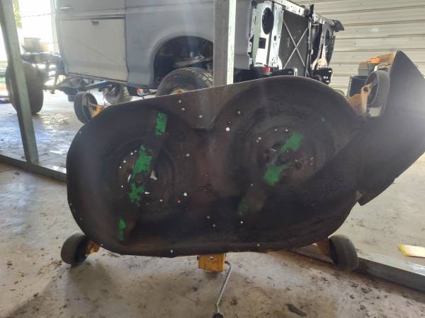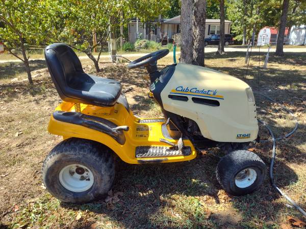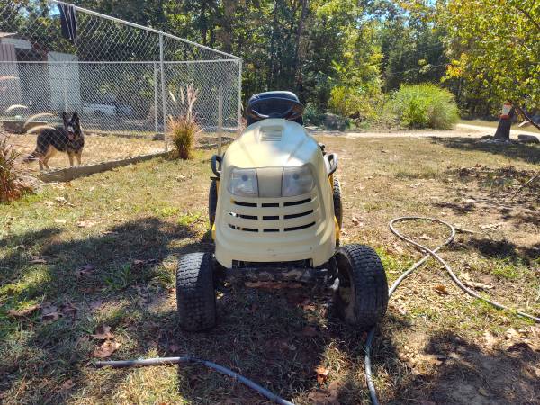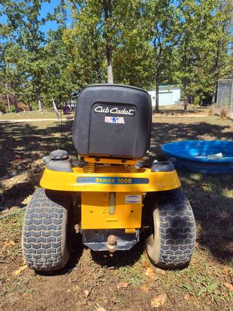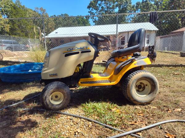 Cub cadet riding lawn mower 42-in cut the key did break so you started with a flathead screwdriver will need to put the deck back on has a slightly bent pulley one spots where some of the plastics are broke friends and drives great we'll need a battery