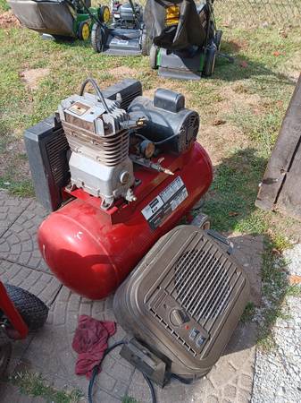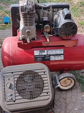 Four horsepower compressor runs real good tank leaks 195 garage heater.75 both are two hundred and twenty volts call .
