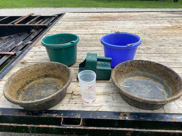 The items available are two 30 Gallon Rubbermaid water Tanks, small leak towards top so actually holds roughly 20 Gallons. A water Tank Heating Element, Blue Feed Barrel that holds a 50 pound bag of feed with a screw on lid to keep mice away, 2 Plastic Feed buckets, 2 Rubbermaid Feed Pans, A Heed Scoop, Purina Measuring Cup and 2 fly traps for your stalls.