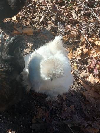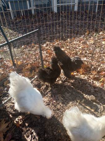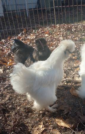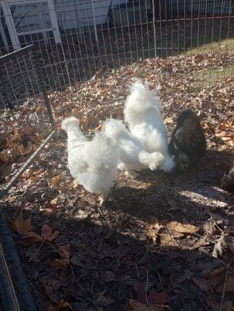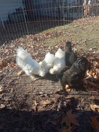 I have silkie CHICKS getting ready to hatch, the pictures are of the parent chickens. Black rooster, white rooster, 2 white hens and a black hen, they all run together. They will be $5 each or 5 for...