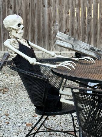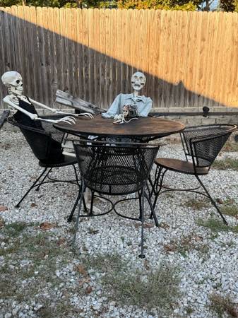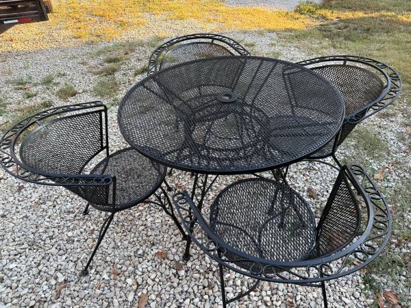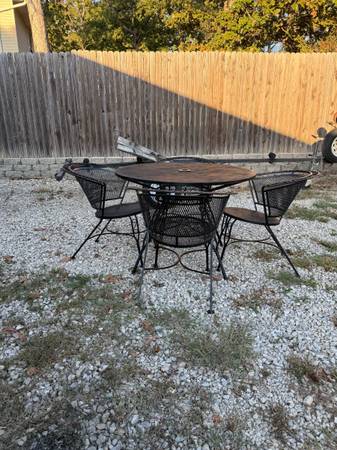 Wrought Iron Patio Set, a 42" Round Table and (4) Matching Wrought Iron Chairs. Table measures 42" in diameter by 29" tall. Chairs measure 30" tall by 26" Sold as a Set Only leave message if no...