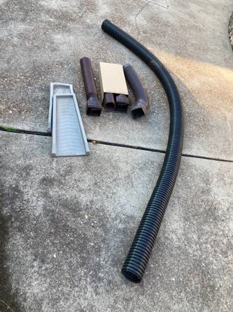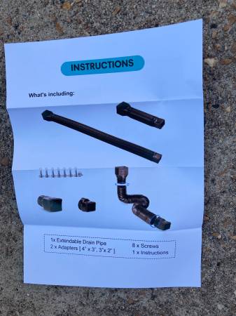 One 4" x 10' black drainage pipe, one 4" x 3' brown expandable gutter extension, two brown extendable drain downspout extenders (one is still in box-never used) extends from 2.6' to 11.5', two gutter splash blocks for downspout. All pieces included - one price. Cash only - Pickup only.