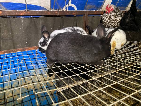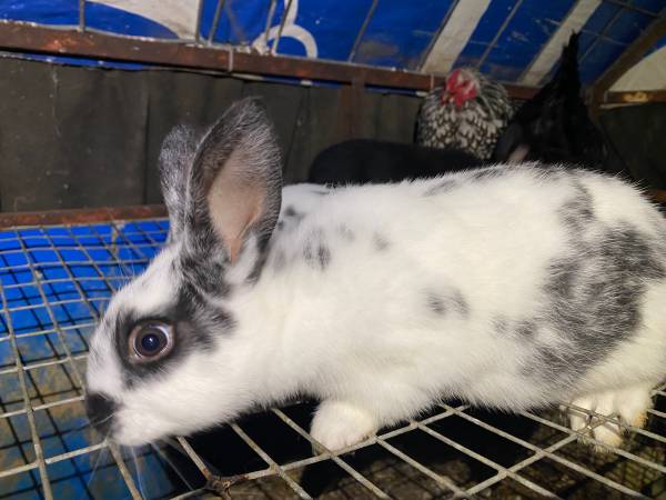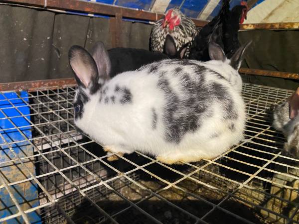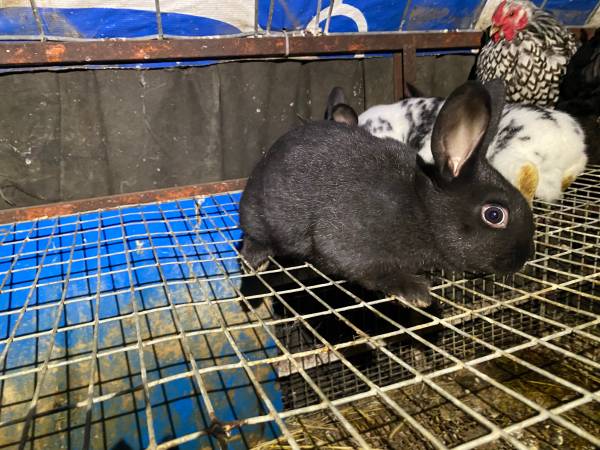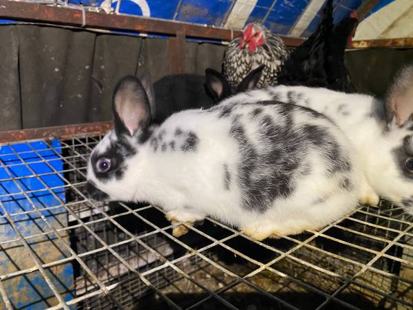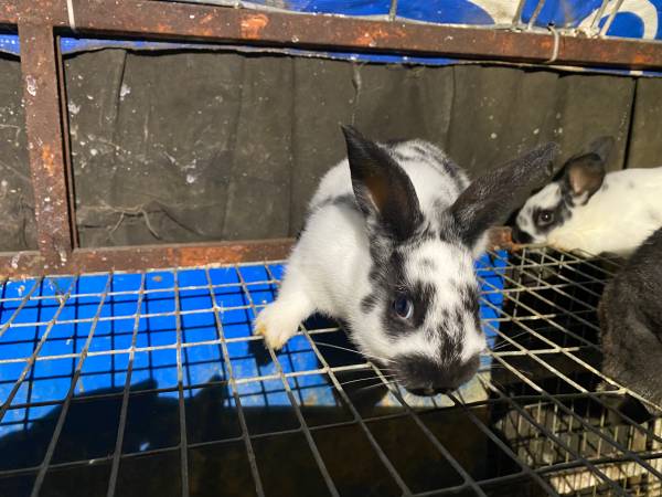 3 New Zealand rabbits for sale 1 black doe 1 white doe with black spots an 1 spotted buck