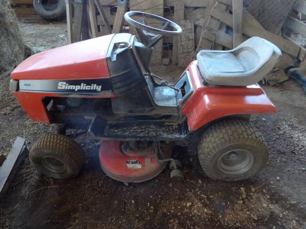 Older Simplicity Riding Mower - Regent 12, 5 speed, 36" cut. It will need a motor, but otherwise it is in good shape. Great for parts or put in a motor. Located in Salem, MO.