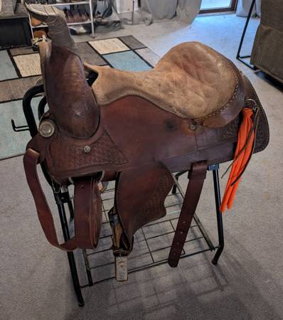 I don't know much about this saddle besides that it is a 14.5 inch seat. Needs TLC. Doesn't fit any of my horses and I don't want it to go to waste. Comes with the breastplate listed. (STAND NOT...