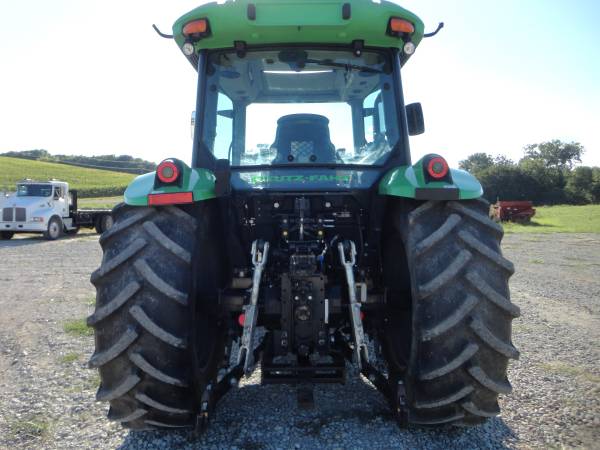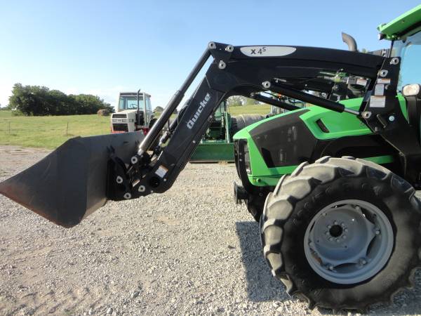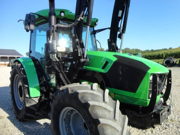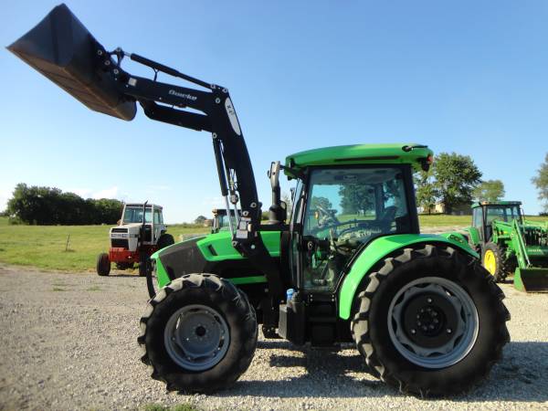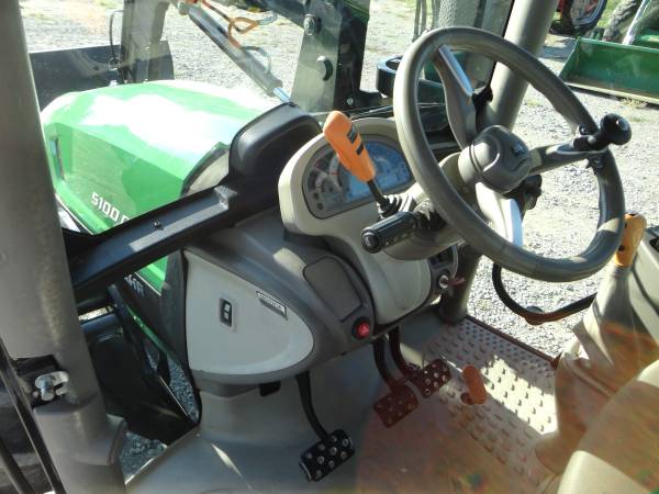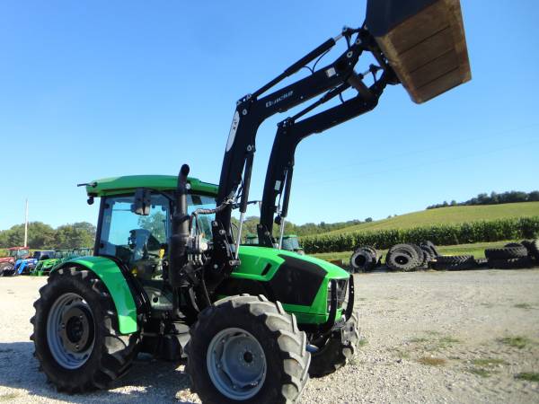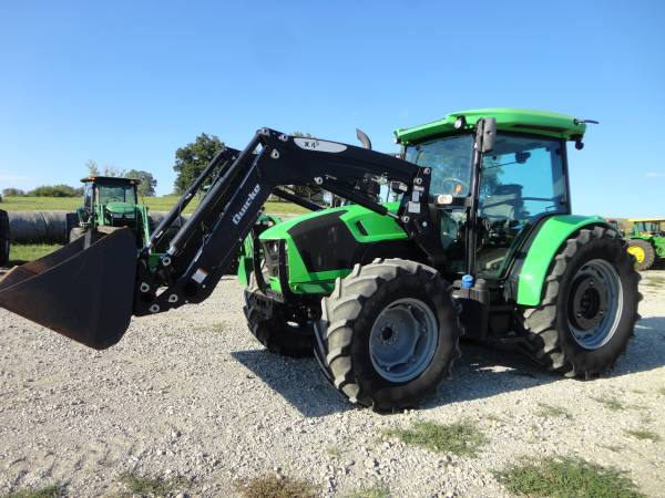 2018 Deutz-Fahr 5100G MFWD cab tractor with loader. Starts and runs great. Has 4 cylinder turbocharged diesel engine. Rated at 97 horsepower. 4,585 hours. Has 40 speed transmission with left hand hydraulic shuttle. 4wd works. Has differential lock, 3 point hitch, 2 hydraulic remotes, 540/540E/1000pto, 3 sets rear wheel weights, rear fender controls, mirrors, grille guard, toolbox and front weight bracket. Cab is in good condition. Has cold A/C, heat, radio and air ride seat. Mitas radial tire's. Rear tires 480/70R34 at 80%. Front tires 420/70R24 at 75%. Comes mounted with Quicke X4S self-leveling quick attach loader. Loader works great and is in good condition. Has factory joystick, mid valve, loader suspension and 82" skid steer style quick attach bucket. Very nice, clean tractor! $39,500 more tractors at bunsetractorinc.com