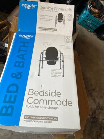 Brand new, never used, in plastic Equate Bedside Commode from Walmart. Needs to be put together. Bought but never used lost receipt. New was $148. Box broke but still have. Easy custom height adjustment from 16-22 in. Longer seat up to 499 lbs weight. No tools needed