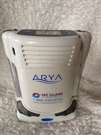 Arya portable rechargeable oxygen concentrator with carrying case, car charger and AC charging cable, 1-5L, nasal cannula, 8 cell battery lasts 3-4 hours, 5 lbs, airline compliant, less than 100...