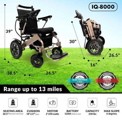★ EASY TO HANDLE - New ComfyGo is Fold and Go, easy folds up in only 3 seconds and fits in most trunks easily. Our lightweight folding wheelchair is very convenient for storage, transport, and travel. The battery is removable and can charge separately. In addition, seat and back rest cushion can be easily removed for cleaning. No assembly required, good to go straight out the box.
