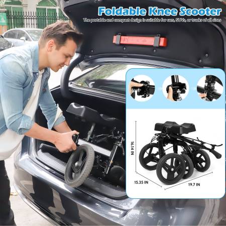 ✅【Adjustable & Portable】:This maneuverable knee scooter features 7 adjustable handlebar positions and 6 adjustable knee pad positions, making it suitable for users of different heights. The foldable design includes two handlebars with quick-release folding switches and limiters, allowing the knee scooter to be compactly folded for easy transport and storage. Additionally, it comes with a storage bag to keep your personal items, freeing up your hands for a safer and more convenient ride.