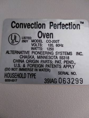 model# CO200T. It has never been used, only tested to ensure it is running and heating as it should. It is in excellent condition, no damage, all accessories and instructions/recipes book are included.