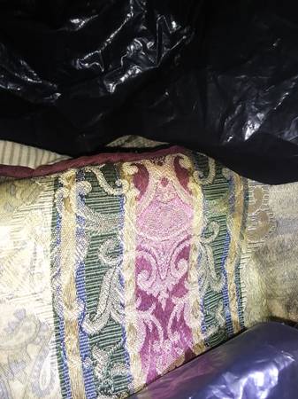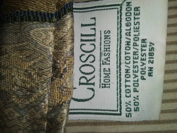 Used Croscill brand King Size Comforter Set which includes the comforter, 2 decorative pillows and a dust ruffle. Beautiful brocade fabric with royal-pattern on one side in mauve/gold/silver/green/blue and cotton striped on the other side. The tassel is missing from one pillow. Made in the USA. It is dry clean only and has been dry cleaned since last used.