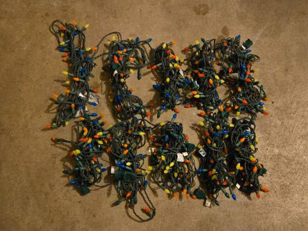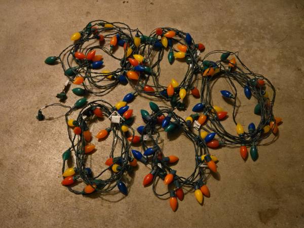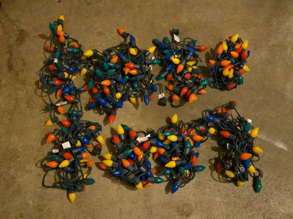 Used multicolored christmas lights Over 550 ft in total length. All tested and working. C9 - 70 bulbs - 5 strands C9 - 25 bulbs - 5 strands C6 - 35 bulbs - 9 strands C3 - 50 bulbs - 11 strands Porch...