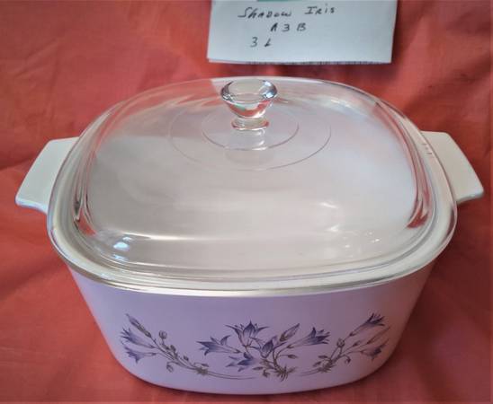 CORNING WARE - designed in BLUE GREEN SHADOW IRIS. Casserole with Pyrex lid. No chips or cracks. 1 LID AND 1 CASSEROLE DISH 3 L, 3 QT. 81/4 " SQUARE, 4 " H. WITH LID APPROX. 6" H FOR OVEN OR...