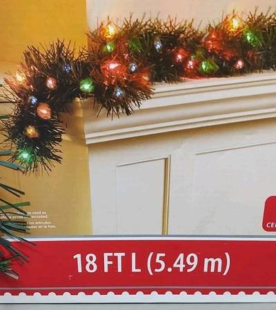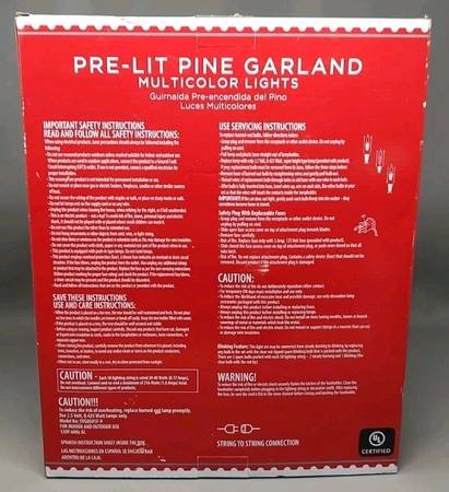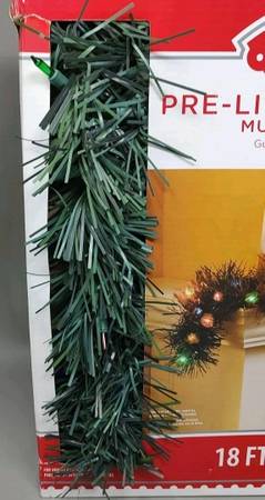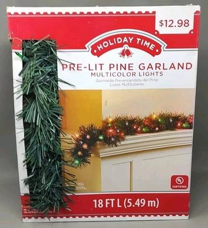 Brand New Holiday Time Pre‑Lit Pine Garland with Multicolor Lights has never been opened or taken out of its original package, so it is in New Condition. This box contains a Set of Two 9-Foot Garlands (18 Feet in Total), each Garland has 50 Multicolor Pre‑Strung Lights, connectable up to 10 Garlands end‑to‑end. Each 9-Foot Garland contains 50 Multicolor Bulbs; the set gives 100 Bulbs total, is rated for Indoor/Outdoor use, and comes from a smoke free and pet free home.
