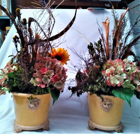 LION HEAD" PLANTERS .VINTAGE "LION HEAD" PLANTERS, YELLOW PORCELAIN . ACCENT WITH 3 PROJECTING LION HEADS ON EACH PLANTER.