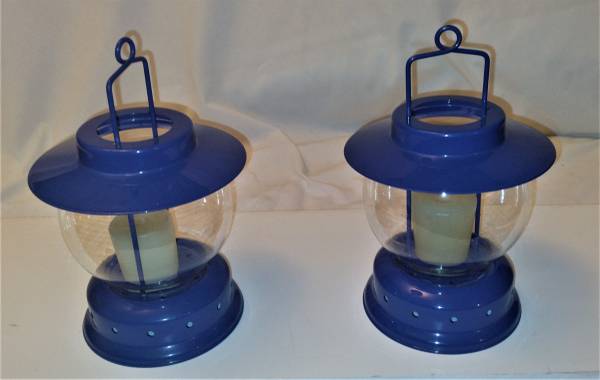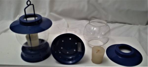Vintage Blue Metal Candle Holder with clear Glass shade.