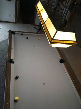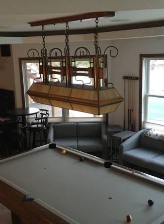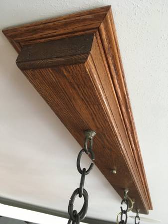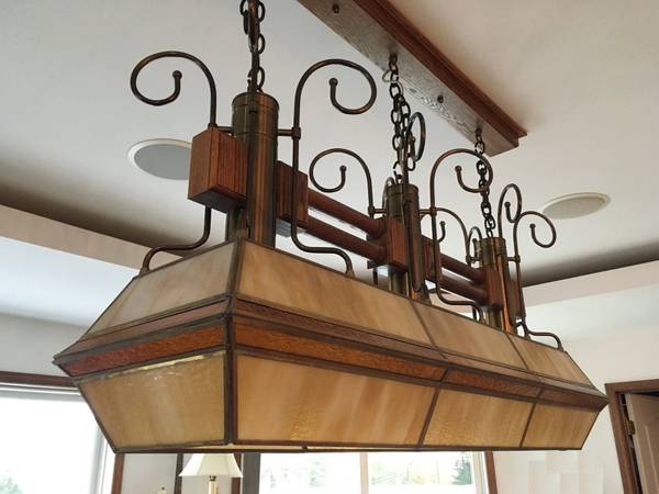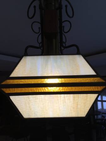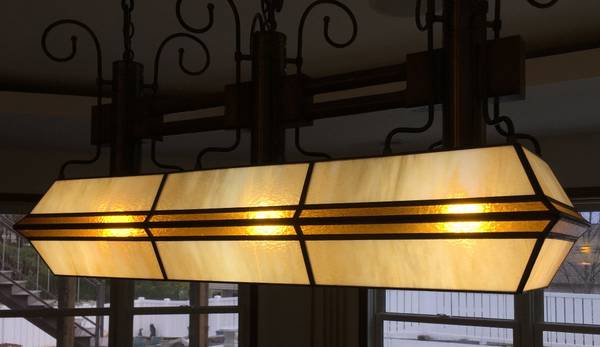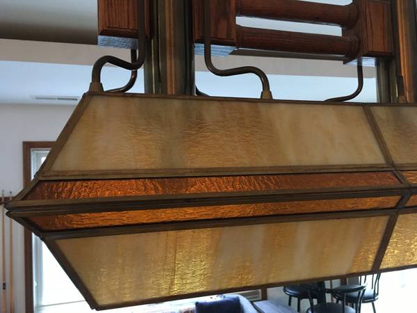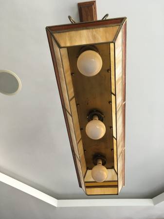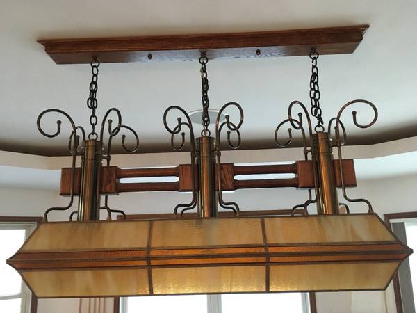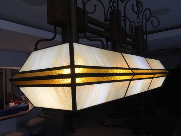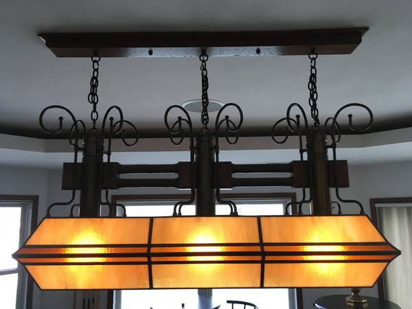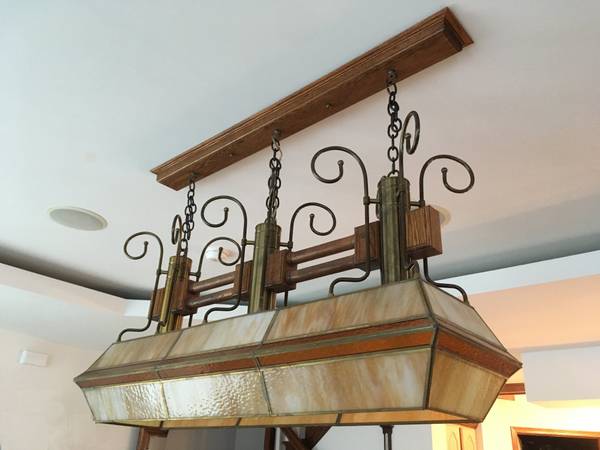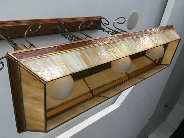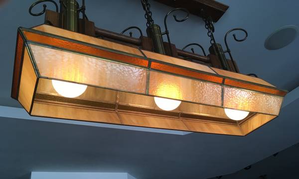 The light is 14.5 x 48 at it widest points, in the photos the bottom is 37" from the ceiling but that can vary +/- 9" with the chain provided. I show photos with the original incandescent globes ("warm") lit up and also with ("cool") LED bulbs installed. The sockets are standard screw in medium base, so you have tons of light bulb options nowadays.