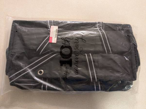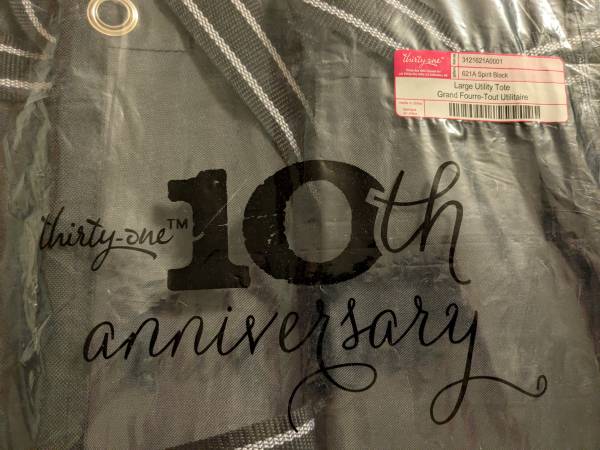 A new/unopened thirty-one Large Utility Tote. The tote is Spirit Black in color with silver strips on the handles. Tote is from their 10th Anniversary Spirit Collection. See pictures for additional information.