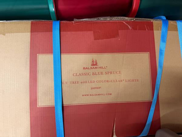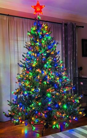 Beautiful Balsam Hill Christmas Tree. LED Color + Clear lights. Great condition, everything works on it. It has the Easy Plug lighting system, just connect the tree parts into the trunk and they light up when plugged in. Always stored away in original box. Has a storage bag that we have never used, metal base, remote control and tree stand.