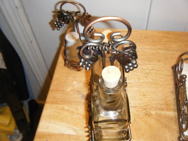 Ornate Grape Motif Salt & Pepper, Napkin Holder, Oil & Vinegar Cruet. Brass finish. All glass containers. No chips or cracks.