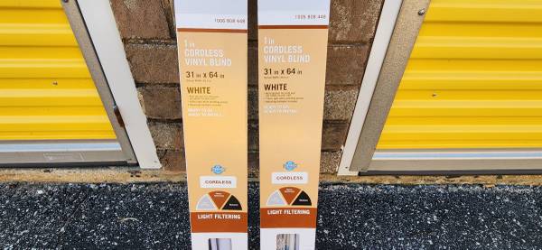 For Sale $6 buys BOTH (2) New in Box 1in Cordless Vinyl Blinds (31in x 64in) White Width 30.5in Ready to Go, Ready to Install OPEN BOX