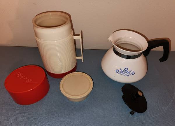 * Vintage Corningware six cup porcelain coffee/tea pot with removable plastic lid. It is white with a blue cornflower design. It does not come with a percolator basket. It measures 5 inches high. $3