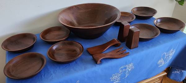 This is a vintage wooden bowl set made by Ozark Walnutware Native Wood Products of Ozark, Missouri. The set is in very good condition and includes the following pieces: