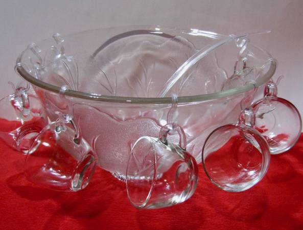 Great for all of your family and holiday gatherings to serve punch and other beverages. The glass punch bowl is 14 1/4” across and 8” tall with a beautiful leaf pattern. The set includes a clear ladle, 8 glass cups and 8 hooks to hang the cups on the edge of the punch bowl. This set is perfect for all occasions and is in like new condition.