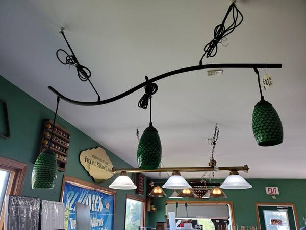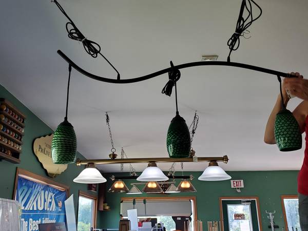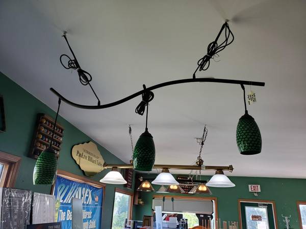 NEW three shade ceiling light for sale. Black metal curved bar with scaled green glass shades. Can be hung two different ways, with the shades even or uneven. Can be used for a pool table, bar, or kitchen island light. Make an offer. Cash or Fair offer.