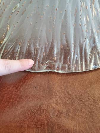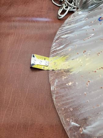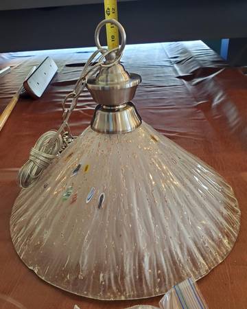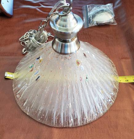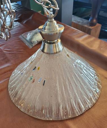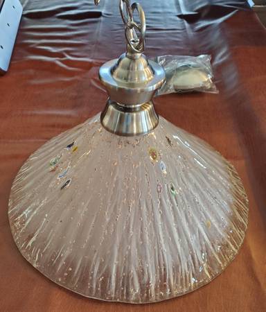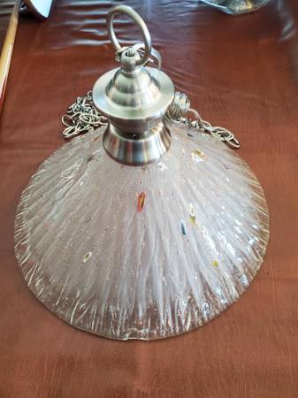 For SALE OLD STOCK Pendent light. Frosted clear glass shade with multi color spots. Brushed nickel with one shade. Chain is 6ft long. Can be used for a kitchen, bedroom, or a dining room. One manufacture defect on the rim, seen in pictures. Cash or Fair offer.