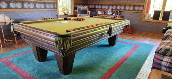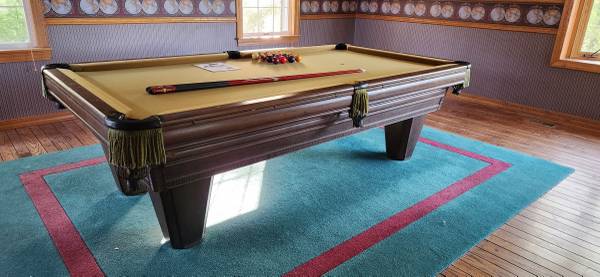 For Sale USED 9' Brunswick Heritage SNOOKER table, built in the late 1970's. Solid mahogany and mahogany on plywood. 3-peice Italian slate. The $2,750.00 price for the table is with Simonis 760. Simonis 760 is the cloth used for snooker, a very quick cloth. The price can be lowered to $2,495.00, if championship invitational is installed instead. However the cloth is slower and wont play as quickly as Simonis.