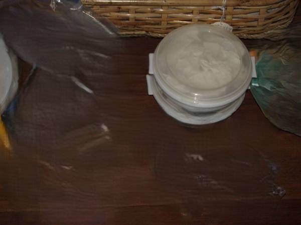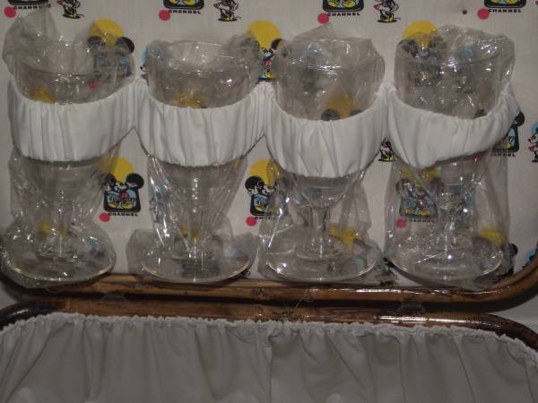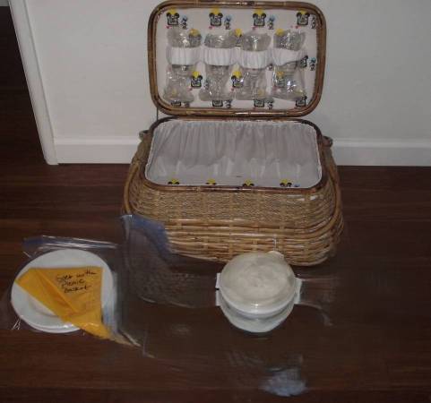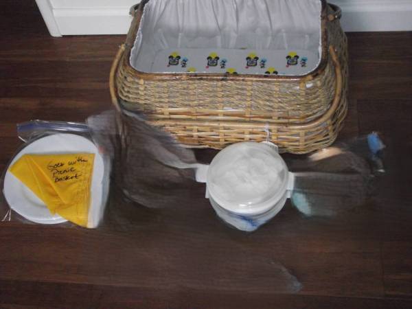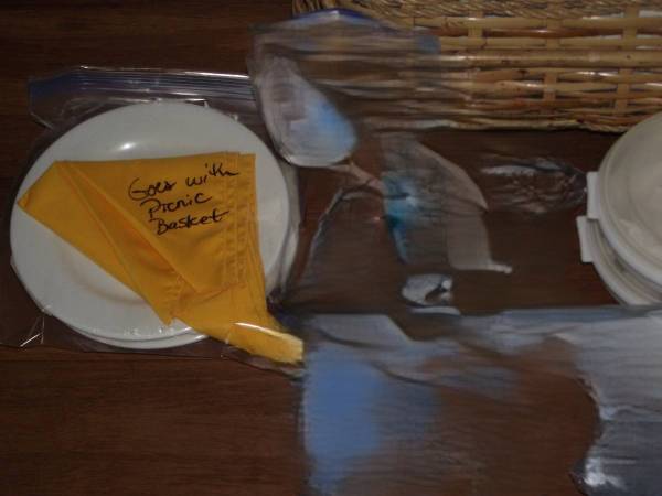Plastic wine glasses, knives, forks and spoons, plates, cloth napkins and storage bowl containers