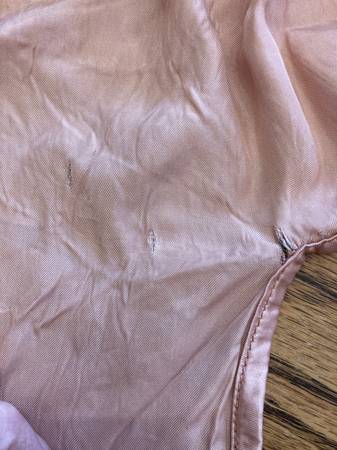 Antique Twin Bedspread w/Skirt Satin 87" x 92" (w/out skirt 37" (Skirt is 25"). Pink /peach? color with cotton backing attached to top center only (stitching is loose or detached in areas). I have a second spread for sale it is torn (not in photo's but it's the same) Few small rips in skirt (none in center spread). I live close to south county mall in Oakville. I prefer text or call please, thanks.