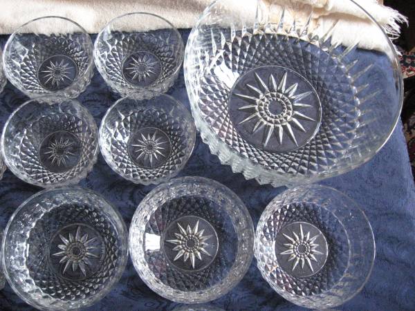 Arcorac Diament French Starburst Salad Set, tempered glass, one 9" bowl and eleven matching 5" bowls, plus one non-matching 4 3/4" bowl to make a dozen individual bowls, $10.00.