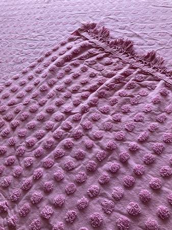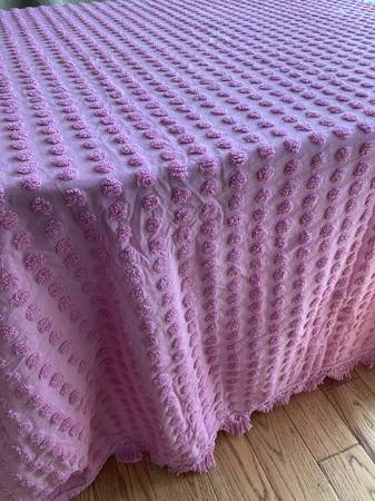 (# 19) Full Size (or smaller) Bedspread with 2 Shams 100% Cotton Pink Martha Stewart. 114" long x 96" wide, (not including fringe) Fring on 3 sides. Color faded areas and one missing chenille dot top. I live close to south county mall in Oakville. I prefer text or call please, thanks.