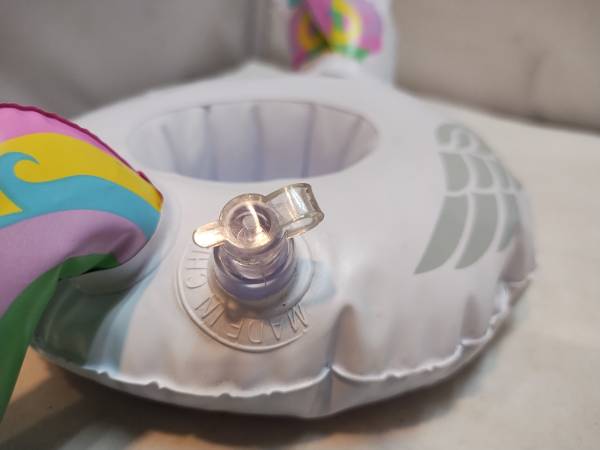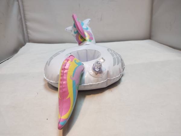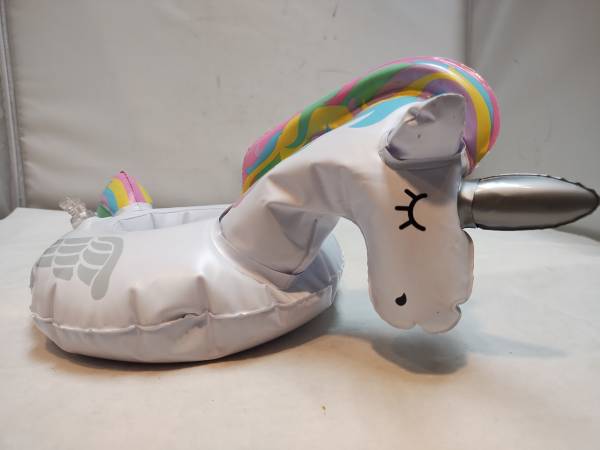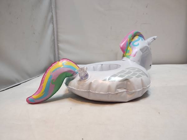 One inflatable floating cup holder with a unicorn head and tail attached. The right side has a winking eye; the left side has on open eye. Product will be shipped deflated; measurements refer to the product after inflation.