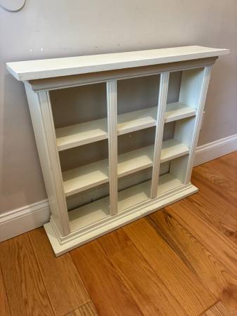 Cabinet Wooden Bookcase /Display /Hutch. 28 1/2" Tall x 32" Wide and 7 3/16" Deep. Off white paint has dirty spots and very bottom has gray half circles. Very bottom under side is not painted. It wiggles from side to side, (I haven't tried fix). The top 2 shelves do not meet up to vertical side. I live close to south county mall in Oakville. I prefer text or call please, thanks.