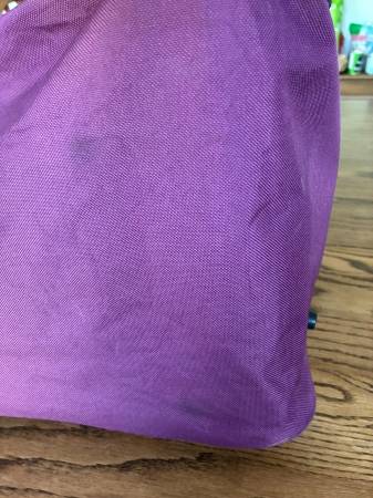 Duffel bag size 12 1/2" Tall x 23" Wide and 11 1/2" Deep. Slightly worn on bottom, little dirty in spots and one pin hole size hole.